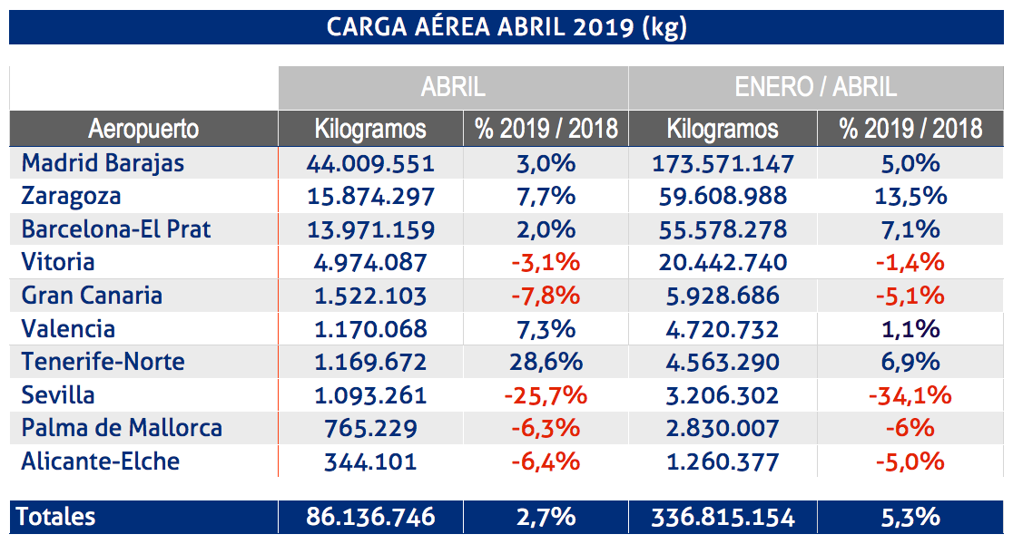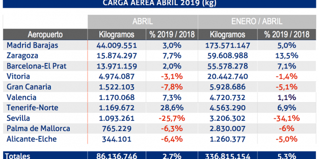 El aeropuerto Adolfo Suárez–Madrid Barajas presenta un crecimiento de un 3% en abril para un total mensual de 44.009.551 kg de carga aérea, con lo que acumula un ascenso de un 5% en el cuatrimestre, mientras que el aeropuerto de Zaragoza, ha manipulado 15.874.297 kg en el último mes, un 7,7% anual más y un 13,5% frente a los cuatro primeros meses del año pasado.