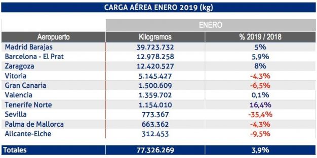 Los volúmenes de carga movidos en la red de Aena han anotado un incremento del 3,9% en el primer mes de 2019, con un total de 77.326.269 kg de mercancía manipulados en los aeropuertos del país.