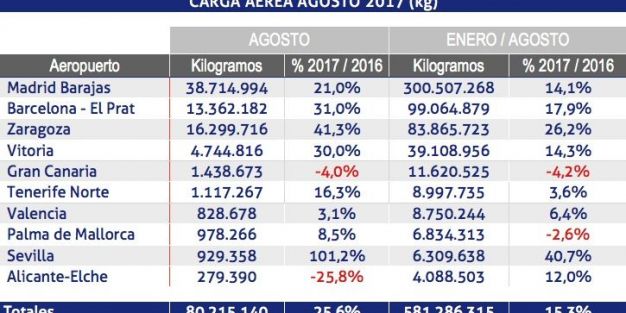 Durante el mes de agosto de 2017, los aeropuertos españoles de la red de Aena han transportado 80.215.140 kg de carga aérea, lo que supone un 25,6% más que en el mismo mes de 2016, situándose el acumulado del ejercicio en 581.286.315 kg, un 15,3% más que la carga manipulada en los ocho primeros meses del ejercicio anterior.