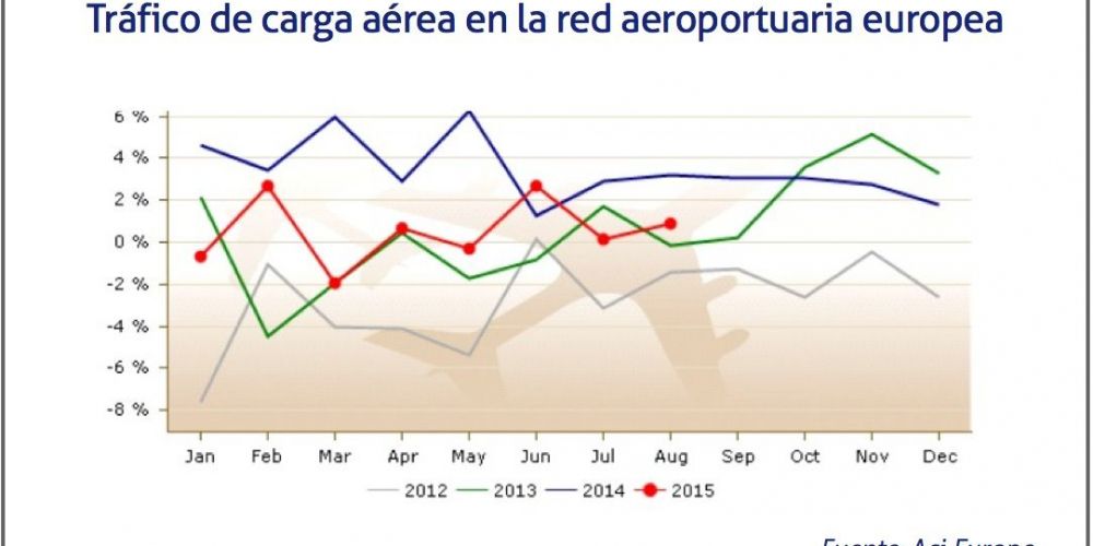 El tráfico de mercancías manipuladas a través de la red aeroportuaria europea ha aumentado, en agosto de 2015, un 0,9% con respecto al mismo mes del ejercicio anterior. En la variación interanual, el tráfico se mantiene estable, con un ligero aumento del 0,4%.