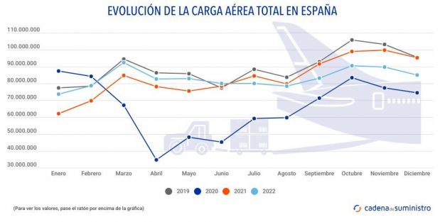 De igual manera, en todo 2022, el tráfico total del sistema aeroportuario español suma, por lo que respecta a la carga aérea, un total de 1.000.356.239 kg de mercancías, un 0,2% anual más, aunque, a su vez, permanece un 6,5% por debajo de los volúmenes de 2019.