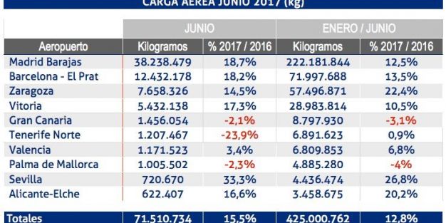 Durante el mes de junio de 2017, los aeropuertos españoles de la red de Aena han transportado 71.510.734 kg de carga aérea, lo que supone un 15,5% más que en el mismo mes de 2016, situándose el acumulado del ejercicio en 425.000.762 kg, un 12,8% más que la carga manipulada en el primer semestre del ejercicio anterior.