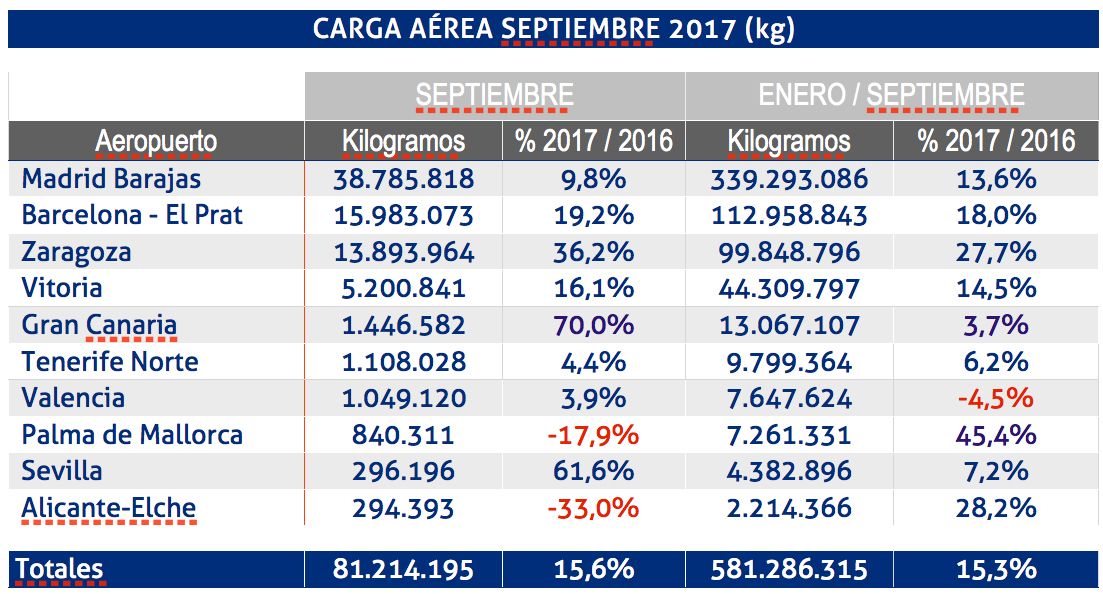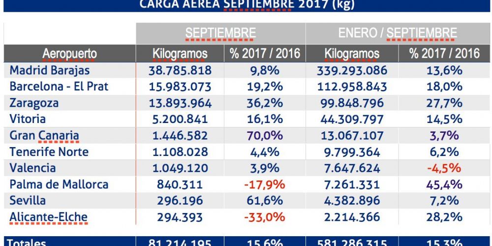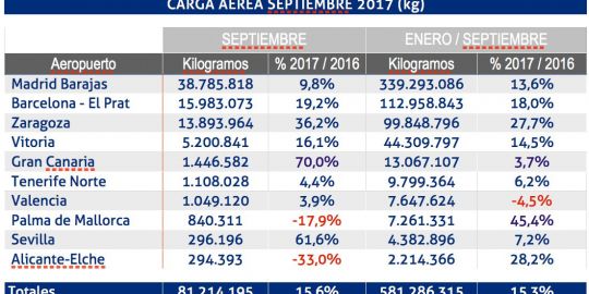 Durante el mes de septiembre de 2017, los aeropuertos españoles de la red de Aena han transportado 81.214.195 kg de carga aérea, lo que representa un crecimiento de un 15,6% más con respecto al mismo mes de 2016.