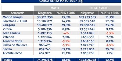 Durante el mes de mayo de 2017, los aeropuertos españoles de la red de Aena han transportado 75.294.678 kg de carga aérea, lo que supone un 18,4% más que en el mismo mes de 2016, situándose el acumulado del ejercicio en 353.490.028 kg, un 12,3% más que la carga manipulada en los cinco primeros meses del ejercicio anterior.