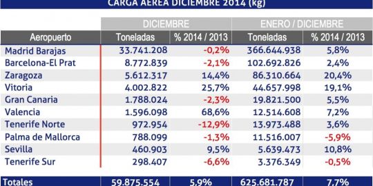 Durante el mes de diciembre, los aeropuertos españoles de la red de Aena han transportado 59.527.487 kg de carga aérea, un 3,0% más que en el mismo mes de 2013. En cuanto a los datos acumulados, el tráfico de carga ha ascendido a 685.209.274 kg, que suponen un 7,2% más que en 2013