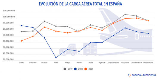 Durante el pasado mes de diciembre, el sistema aeroportuario español ha movido un volumen mensual de 95.332.962 kg de mercancías, un 28,1% más que durante el último mes del año pasado, y, al tiempo, el registro se queda solo un 0,3% por debajo del mismo mes de 2019, cuando aún no había pandemia.