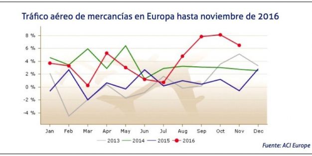 El tráfico de mercancías transportadas a través de la red aeroportuaria europea ha registrado un fuerte crecimiento del 6,5% en noviembre de 2016 en relación al mismo periodo del ejercicio anterior, según reporta ACI Europe.