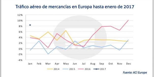El tráfico de mercancías transportadas a través de la red aeroportuaria europea ha registrado un fuerte crecimiento del 8,4% en enero de 2017 en relación al mismo periodo del ejercicio anterior, según reporta ACI Europe. En lo que se refiere al movimiento de aviones, la subida ha sido del 4,8%, vinculada a un significativo aumento de la capacidad de las aerolíneas.