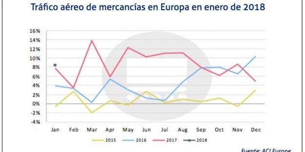 El tráfico de mercancías transportadas a través de la red aeroportuaria europea ha registrado un crecimiento del 8,4% en enero de 2018 en relación con el ejercicio anterior, según los datos de ACI Europe.