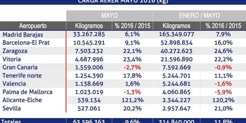 Durante el quinto mes de 2016, los aeropuertos españoles de la red de Aena han transportado 63.596.363 kg de carga aérea, un 9,6% más que en mayo de 2015, situando el acumulado del ejercicio en 314.840.000 kg, un 11,8% más que la carga manipulada durante el mismo periodo del ejercicio anterior.