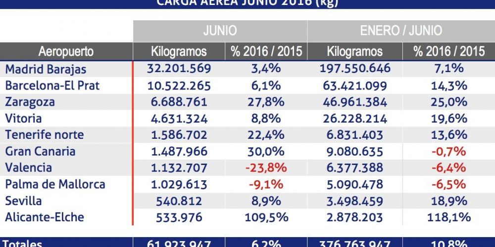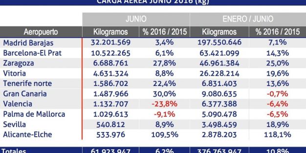 Durante el sexto mes de 2016, los aeropuertos españoles de la red de Aena han transportado 61.923.947 de carga aérea, un 6,2% más que en junio de 2015, situando el acumulado del ejercicio en 376.763.947 kg, un 10,8% más que la carga manipulada durante el primer semestre del ejercicio anterior.