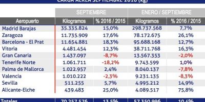 Durante el noveno mes de 2016, los aeropuertos españoles de la red de Aena han transportado 70.257.576 kg de carga aérea, un 13,5% más que en septiembre de 2015, situando el acumulado del ejercicio en 574.350.996 kg, un 10,4% más que la carga manipulada durante los nueve primeros meses del ejercicio anterior.