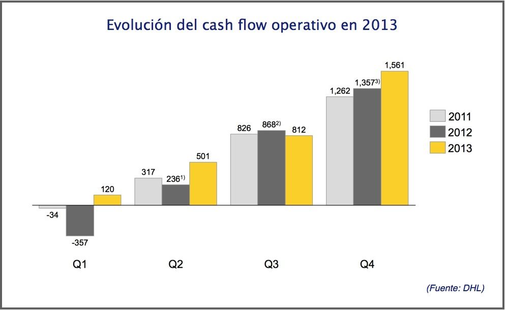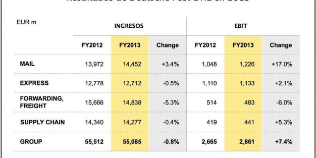 Los ingresos del grupo Deutsche Post DHL han descendido un 0,8% hasta alcanzar los 55,1 mil millones de euros durante el 2013, frente a los 55,5 mil millones de 2012, como consecuencia del tipo de cambio negativo y otros efectos inorgánicos. Sin embargo, ajustados por estos factores, la facturación ha aumentado un 3%, impulsada sobre todo por un aumento de volumen e ingresos en el negocio de la paquetería en Alemania.