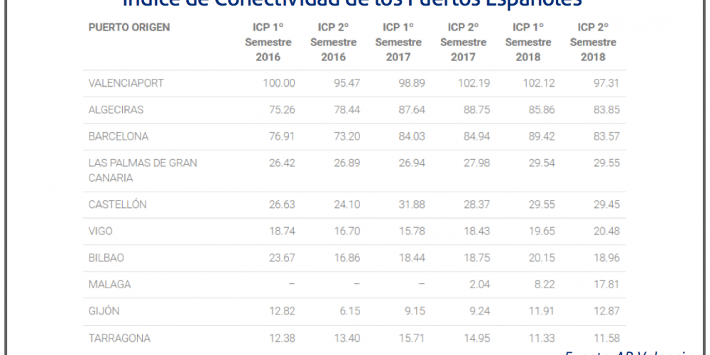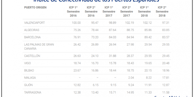 En su primera referencia, el índice ICP para el segundo semestre de 2018 coloca al puerto de Valencia como el primer puerto en términos de conectividad y competitividad marítima con una puntuación de 97.31. Tras él se colocan Algeciras, con 83.85 puntos, y Barcelona, con 83.57.