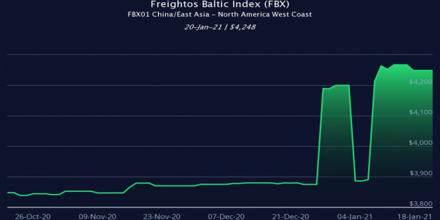 Las tasas de carga de contenedores entre China y la costa oeste de Estados Unidos permanecen invariables en los 4.248 dólares/FEU, según Freightos, lo que supone un incremento del 182% respecto al mismo periodo del año anterior.
