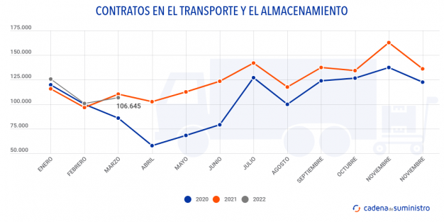Así pues, durante el pasado mes de marzo se han registrado 106.645 contratos de trabajo nuevos en el sector del transporte y la logística, un 3,14% menos que en el mismo mes de 2021, aunque un 6,11% más que en febrero.