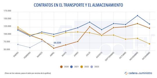 Durante el cuarto mes de 2023, se han registrado descensos generalizados de la contratación por segmentos de actividad, salvo en el transporte marítimo.