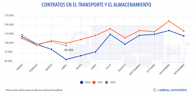 Así pues, durante el pasado mes de abril se han registrado 95.550 contratos de trabajo nuevos en el sector del transporte y la logística, un 6,71% menos que en el mismo mes de 2021, así como un 10,4% menos que en marzo.