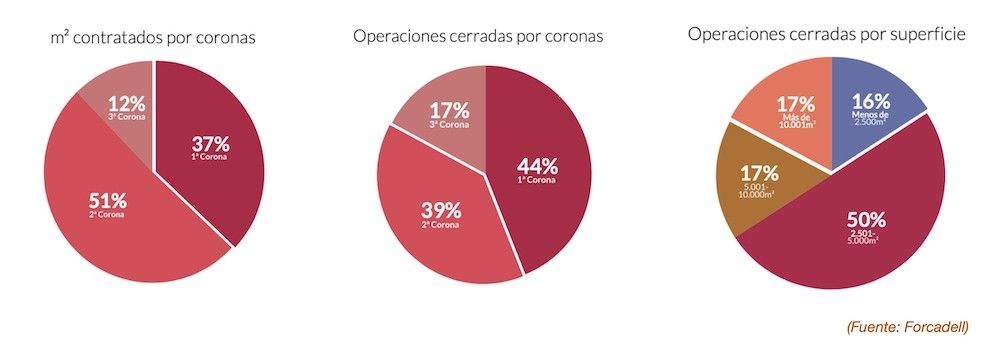 En el último trimestre, el descenso se situó en un 18% respecto al ejercicio anterior, habiéndose cerrado un total de 18 operaciones. Ocho de ellas corresponden a la primera corona, con 37.359 m2, siete a la segunda corona, con 50.874 m², y otras tres a la tercera, con 12.182 m2.