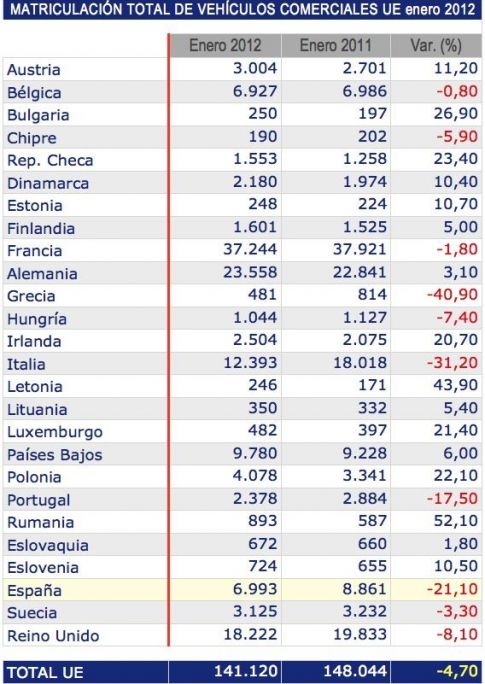 En cuanto a los vehículos industriales ligeros de hasta 3,5 Tn sufrieron en enero una caída del 6,4%, matriculándose un total de 114,164 ud. Francia siguió siendo el mayor mercado de furgonetas, a pesar de una caída de 2,6%, seguido de Alemania, que fue el único mercado de crecimiento significativo. En el Reino Unido las matriculaciones de este segmento disminuyeron un 16,4%, y en España un 19,8%. Italia fue el país que sufrió una mayor caída, del 32,8%.