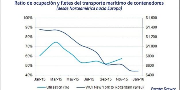 La demanda del transporte marítimo de contenedores en el comercio entre Norteamérica y el norte de Europa no ha cubierto el 70% de la oferta en los últimos meses de 2015.