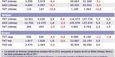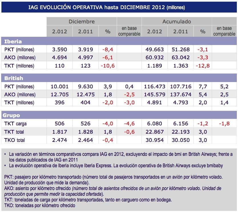 En el mes de diciembre de 2012, la demanda conjunta del grupo, medida en pasajeros-kilómetro transportados, se ha incrementado un 0,3%, frente a una caída de un 2,1% en base comparable. El volumen de oferta, medido en número de asientos-kilómetro ofertados disminuyó un 0,4%, que en base comparable equivale a una reducción del 3,5%.