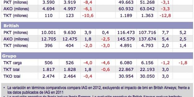 British por primera vez en el año deja ver los números rojos. Así las toneladas de carga por kilómetro transportadas TKT, correspondientes a diciembre, tanto teniendo en cuenta el impacto de bmi como excluyéndolo, caen un 2%. La aportación de Iberia, que es del 28% con respecto al total de carga transportada en conjunto, se deja notar, de forma que en el acumulado anual el grupo pierde finalmente un 1,2%.