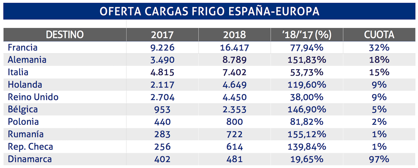 Por el contrario, Holanda, tercero en el podio, también ofrece un decrecimiento del 20,5%. Por último, en cuanto a las cargas nacionales, el transporte frigorífico goza de una salud envidiable, siempre creciente con un 9,6% más de actividad respecto al año pasado.