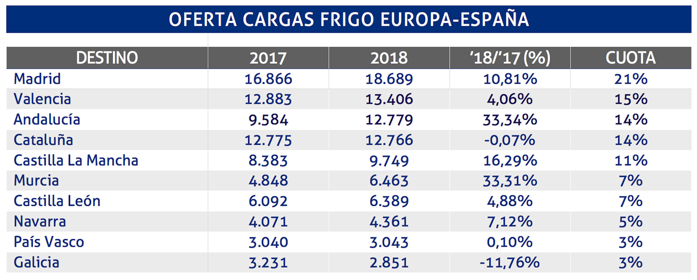 Cataluña, la Comunidad Valenciana y Andalucía prácticamente envían el 60% de mercancía refrigerada que se queda en nuestro país, con notables crecimientos de la actividad, salvo en el caso de Andalucía, cuya actividad es lévemente inferior al 2018. Destacan, sin embargo, Galicia y Murcia con un crecimiento en torno al 18% y, sobre todo, Navarra, con un 50% más de ofertas de cargas frigo.