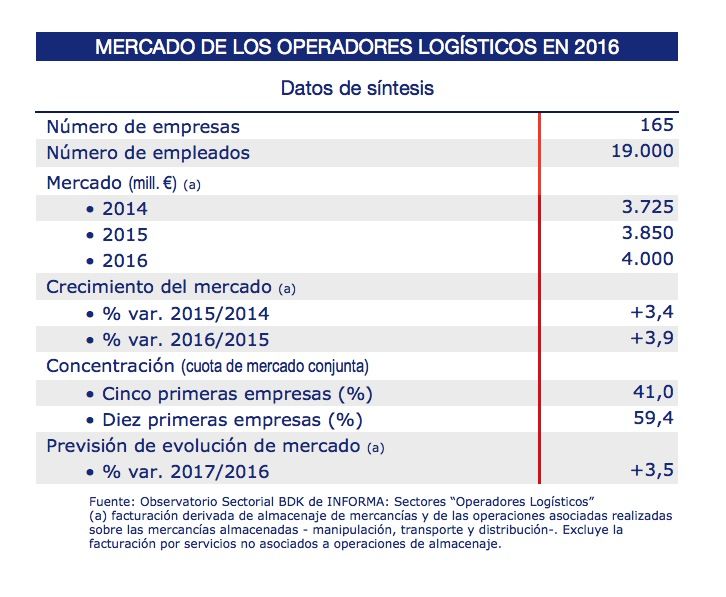 El volumen de negocio de los operadores logísticos ha mantenido en 2016 un moderado crecimiento de 3,9%. Este aumento se ha sustentado en el dinamismo de la actividad en algunas de las principales ramas industriales clientes, como automoción, farmacia o confección- textil, el ascenso de la demanda derivada de transporte internacional y el aumento de las transacciones de comercio electrónico.