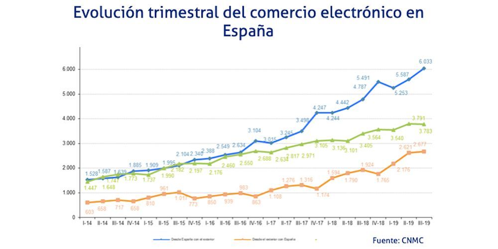 La facturación del comercio electrónico en España ha aumentado en el tercer trimestre de 2019 un 23,5% interanual hasta alcanzar los 12.493 millones de euros, según los últimos datos de la Comisión Nacional de los Mercados y la Competencia.