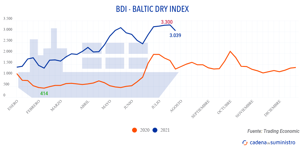 El Baltic Dry Index, BDI, que refleja los precios de los fletes de los buques graneleros tomando como referencia un total de 23 rutas marítimas, se ha situado el viernes 16 de julio de 2021 en los 3.039 puntos. Esto supone una caída de 34 puntos o del 1,1% durante la última jornada y del 7,9% a nivel semanal.