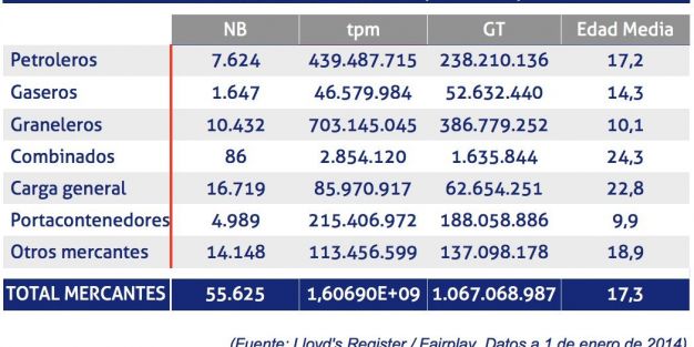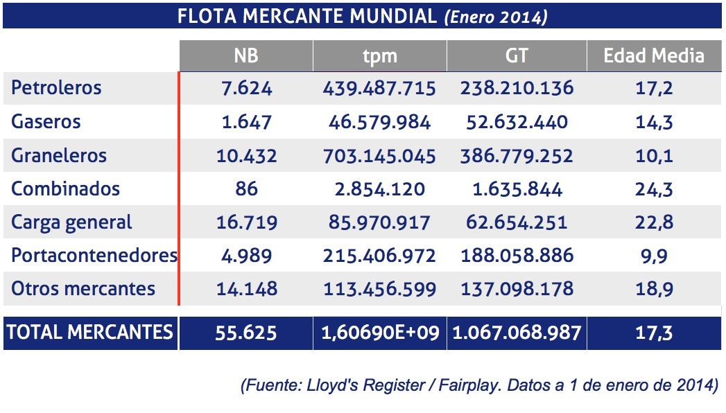 Según los datos definitivos de las World Fleet Statistics publicadas por Lloyd’s Register/ Fairplay, a 1 de enero de 2014, la flota mundial de buques mercantes comprendía un total de 55.625 unidades, con 1.606,9 millones de toneladas de peso muerto (tpm) y 1.067,1 millones de toneladas de arqueo bruto (GT).