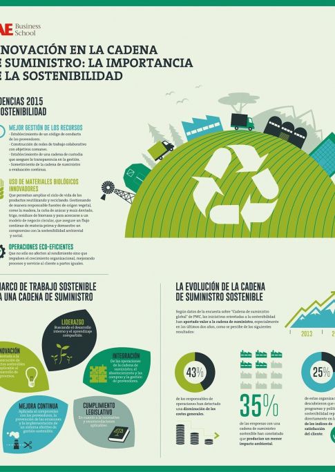 La sostenibilidad está a la orden del día como uno de los factores que más preocupan a las empresas actuales y, también, a las empresas de logística y a la cadena de suministro. Por ello, la EAE Business School ha realizado una infografía sobre la evolución de la sostenibilidad en la cadena de suministro y sus tendencias para 2015.