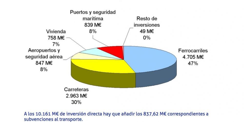 De la inversión total del Grupo Fomento, que asciende a 10.161 millones de euros, el modo más beneficiado vuelve a ser el ferrocarril que aglutina el 47% de la misma, hasta alcanzar 4.705 millones de euros. A continuación se sitúa la carretera, que con 2.963 millones de euros retiene otro importante 30% de la inversión. Por detrás se sitúan Aeropuertos y seguridad aérea (847 millones de euros, el 8%); Puertos y seguridad marítima (839 millones, 8%), mientras que el 7% corresponde a la inversión que el ministerio realiza en el área de vivienda.