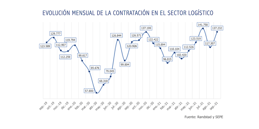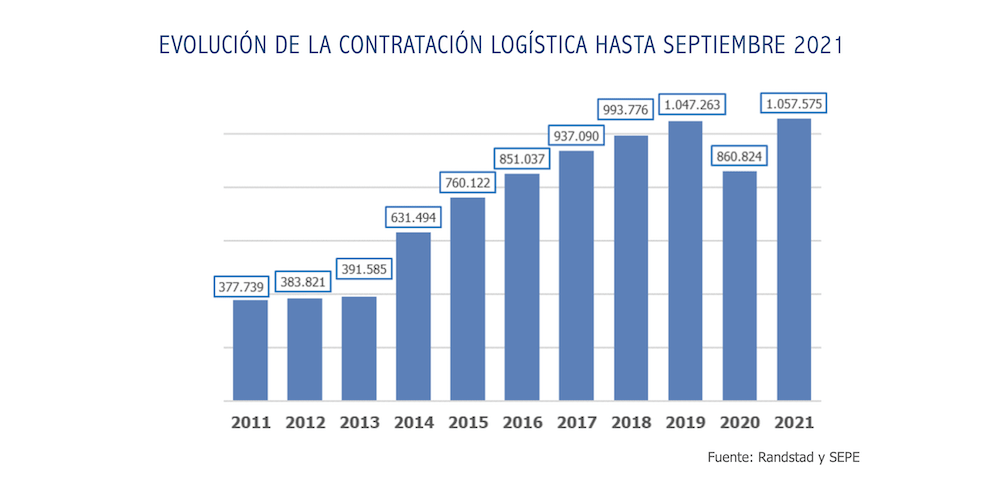 Según un estudio sobre el comportamiento del mercado laboral en las actividades relacionadas con la logística elaborado por Randstad, a partir de los datos del Servicio Público de Empleo Estatal (SEPE), las actividades relacionadas con la logística han generado en España 1.057.575 contratos. Esto supone la cifra más alta de los últimos diez años, mientras que el volumen de contratos durante los primeros nueve meses de 2021 es un 22,9% superior al mismo periodo del pasado año.