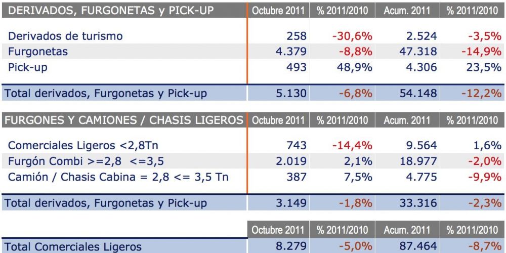 Las matriculaciones de vehículos comerciales ligeros registraron en el período enero‐octubre una fuerte caída de casi el 9%, con un total de 87.464 unidades. En el mes de octubre, las matriculaciones de este tipo de vehículos volvieron a descender un 5%, con 8.279 unidades.