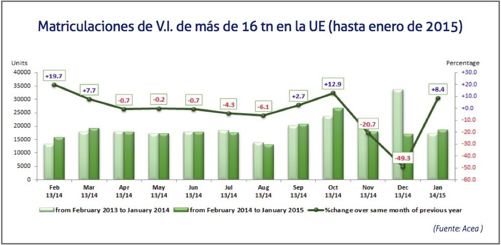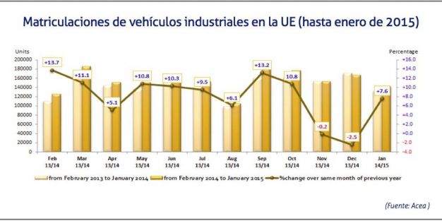 En enero, el segmento de furgonetas ha crecido un 7,4%, alcanzando las 117.138 unidades matriculadas. Los mercados principales de la UE en los se ha vivido un crecimiento han sido España (+31,2%), Reino Unido (+21,7%), Italia (+2,4%), Alemania (+1,4%), excepto Francia, cuyo registro ha sido menor que en enero de 2014 (-8,6%).