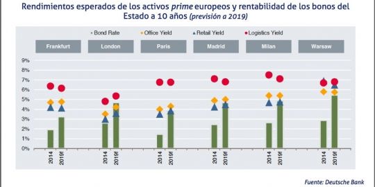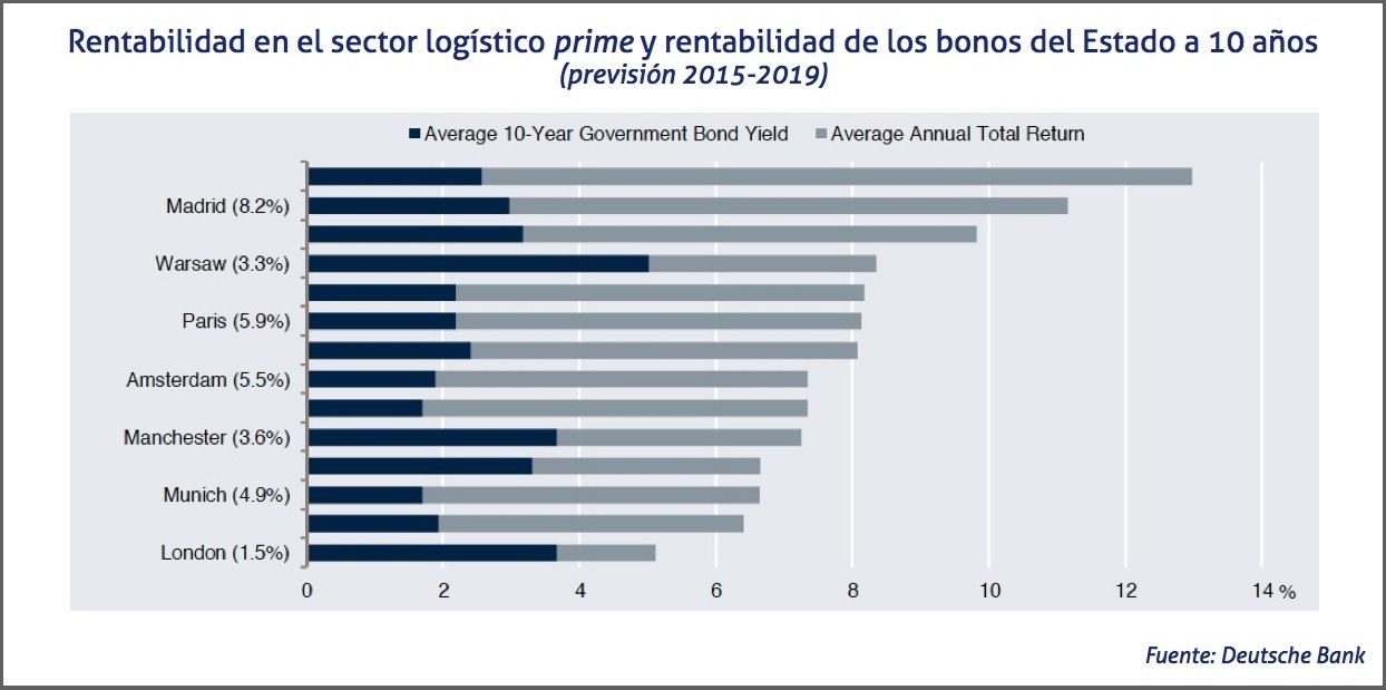 En Madrid, por ejemplo, el rendimiento de las inversiones logísticas en 2014 se ha situado en torno al 7%, mientras que el de las oficinas lo ha hecho en torno al 5% y el del retail ha superado ligeramente el 4%. Por su parte, el interés a 10 años que ofrece el Estado en bonos del Tesoro apenas ha superado el 2%.