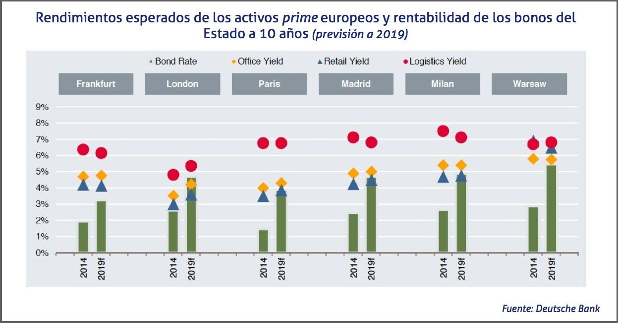 En las áreas urbanas europeas donde están ubicados los principales centros logísticos de sus respectivos países, el rendimiento de los activos logísticos superará con creces, y ha superado ya en 2014, a los rendimientos de las inversiones en oficinas y en tiendas, así como a los bonos del Estado que ofrecen las diferentes regiones, aunque esta diferencia varía sustancialmente de un país a otro.