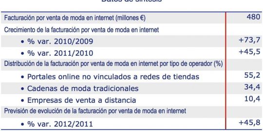 El comercio electrónico en España referido al sector de la moda ha experimentado un sustancial ascenso ya que ha pasado de los 100 millones de euros en 2008 a 480 millones en 2011. Además, durante este último ejercicio ha registrado un crecimiento del 45,5%.