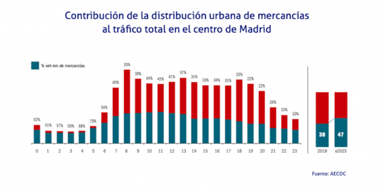 En concreto, durante 2019, su peso sobre el total de la circulación en el centro de Madrid fue del 38%, y se calcula que en 2025 este porcentaje ya será del 47%, algo que se explica por el crecimiento constante del comercio electrónico.
