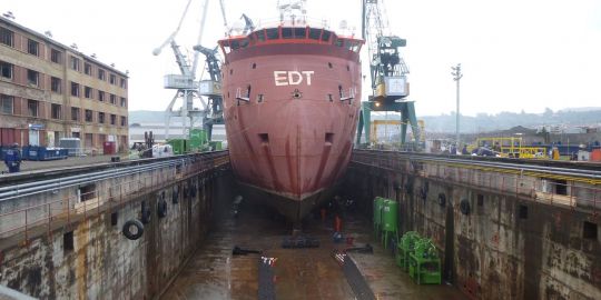 La entrada en el dique se ha producido una vez que los sistemas y equipos del buque han sido totalmente instalados y probados en su fase de muelle. Durante esta etapa, que durará unos 10 días, se procederá a la limpieza y aplicación del esquema final de pintura del casco. Una vez terminado este proceso se llevará a cabo su reflotamiento para la posterior salida a pruebas de mar, previas a la entrega del mismo a su cliente, el armador chipriota EDT Offshore, a lo largo del mes de octubre.