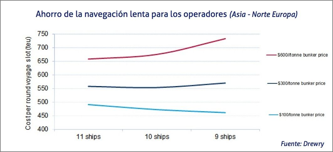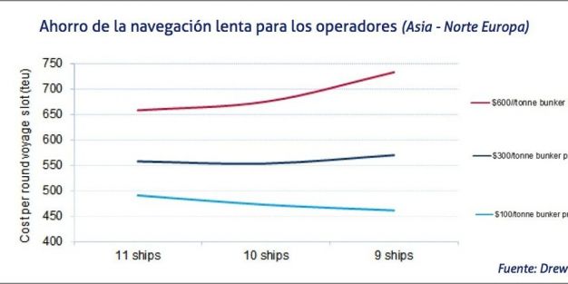 De hecho, según un estudio de la consultora Drewry, con el precio actual del combustible, sería más rentable para las navieras navegar a una velocidad mayor, ya que el aumento del consumo se vería beneficiado por el menor número de buques que serían necesarios para cumplir los servicios.