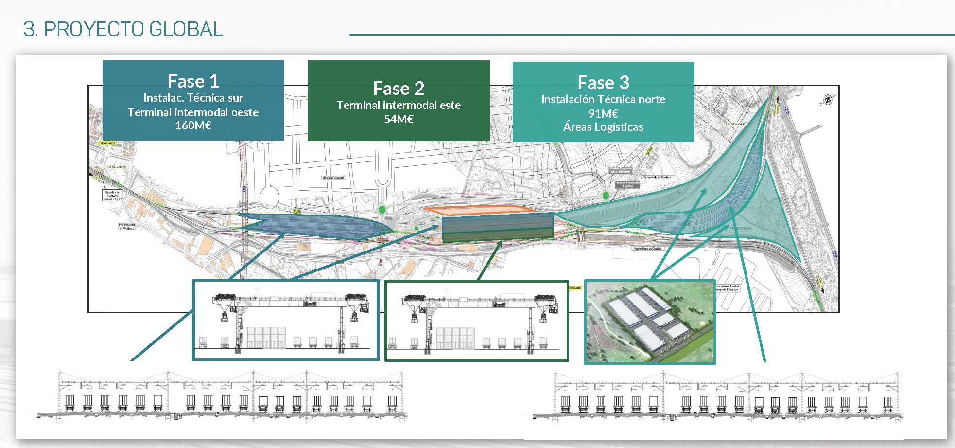 En cuanto a la fase tres, desarrolla la Instalación Técnica Norte, con una inversión de 91 M€, que supone la puesta en servicio de dos áreas para actividades logísticas, en una superficie de 300.000 m², con vocación pura ferroviaria en una de ellas.