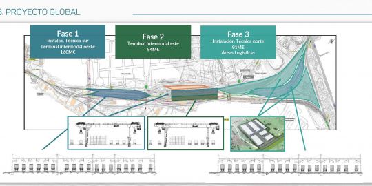 La primera fase, con una inversión de 160 M€, supondrá la ejecución de la Instalación Técnica Sur, inicialmente con cuatro vías de recepción y expedición de trenes para composiciones de 750 metros, además de la superficie destinada a las operaciones de carga y descarga de contenedores bajo el puente grúa, que estará en servicio en 2021.