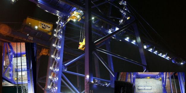 Primera grua portuaria iluminada con proyectores LED en el puerto de Valencia