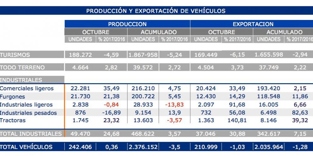 En octubre de 2017, se han fabricado en España 242.406 vehículos, un 0,36% más que en idéntico mes del año pasado, según los datos publicados por la Asociación Española de Fabricantes de Automóviles y Camiones, Anfac.