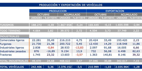 Por otra parte, en dicho mes, se han exportado un total de 210.999 vehículos que han sido producidos en España, lo que supone un retroceso del 1,03% con respecto al mes de octubre de 2016.