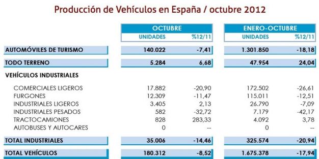 La producción total de vehículos en España en los diez primeros meses del año ha registrado una caída del 17,94% con un total de 1.675.378 unidades. Los turismos han experimentado un descenso del 18,18% mientras que los vehículos industriales han retrocedido más del 20%.